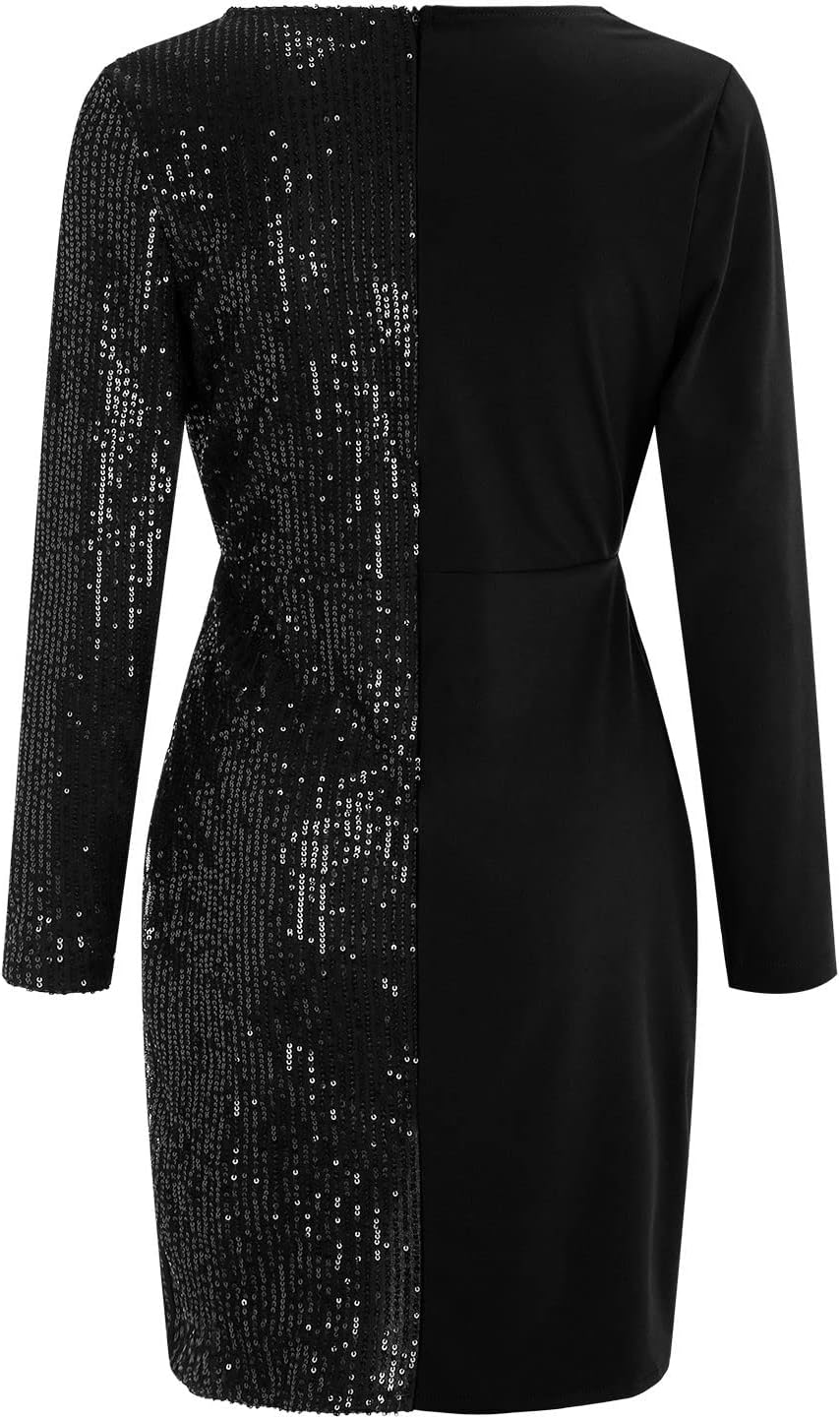 AMhomely Elegant Long Sleeve V Neck Wrap Sexy Sequin Dress Bodycon Evening Night Cocktail Dress Party Mini Dresses for Women UK Size Party Elegant Dresses Clearance Work Dress Office Dressing