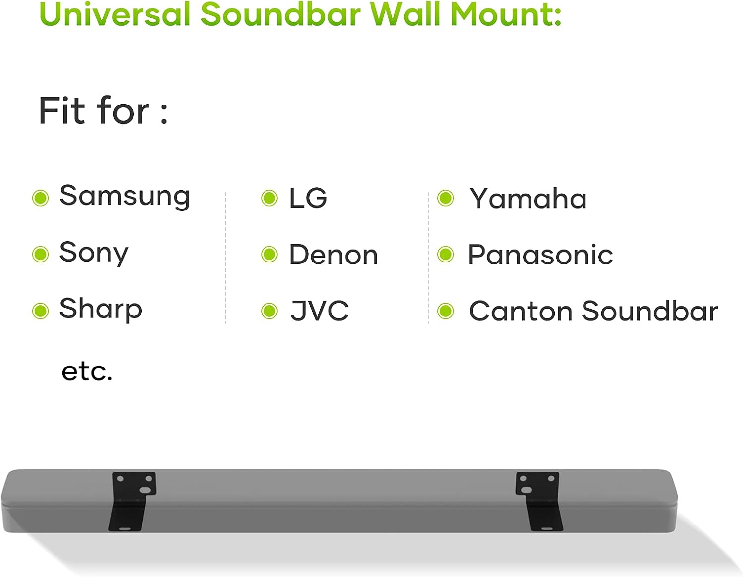 Universal Soundbar Bracket Mount: Universal mounting bracket perfect for most of sound bars, such as compatible with Samsung, Sony, LG, Panasonic, Sharp and more soundbars. The max width that can fit the soundbar is 4.75″.