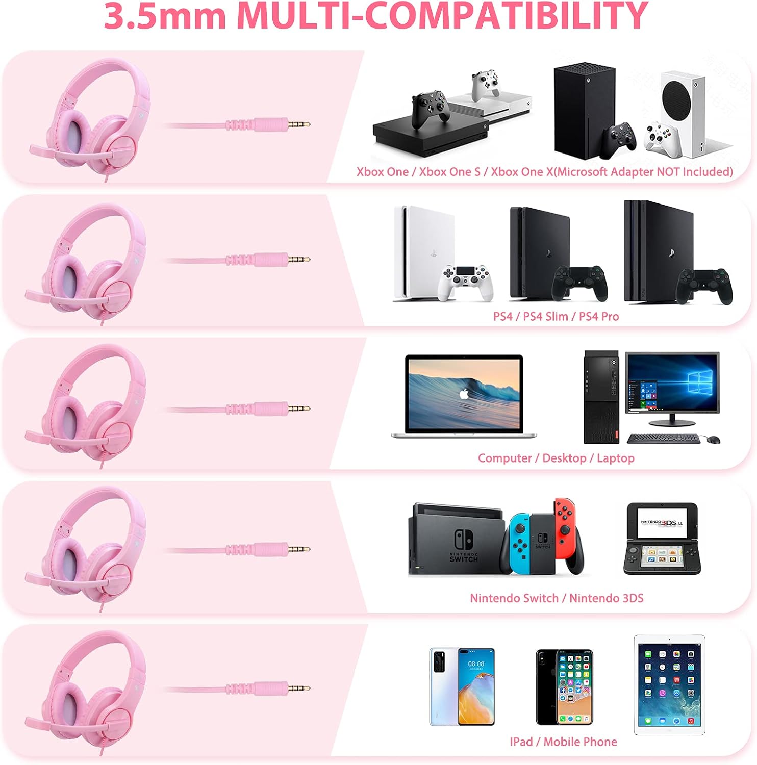 Widely compatible. 3.5mm connector fits most of devices like PS4 / New Version Xbox One / Xbox One S / Nintendo Switch / PS4 Slim / PS4 Pro / Computer / Desktop / Laptop.(Microsoft adapter is NOT Included which is needed when used with old version Xbox One)