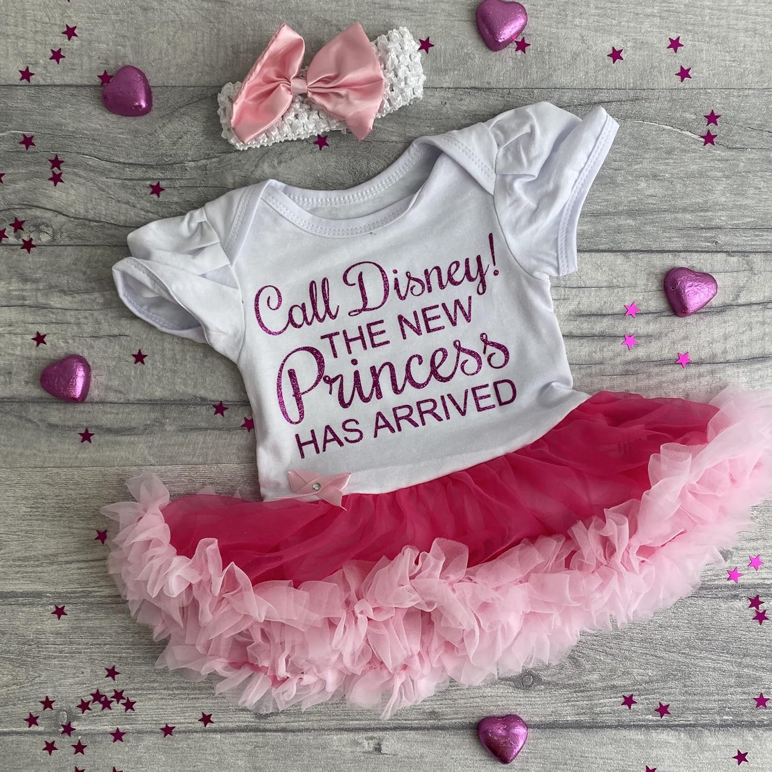 Baby Girl’s Newborn Disney Princess Outfit. White with Pink short sleeve cotton soft tutu romper with matching bow and headband. Dark Pink glitter lettering ‘Call Disney! The New Princess has Arrived’. Perfect outfit for a newborn baby girl and keepsake present!