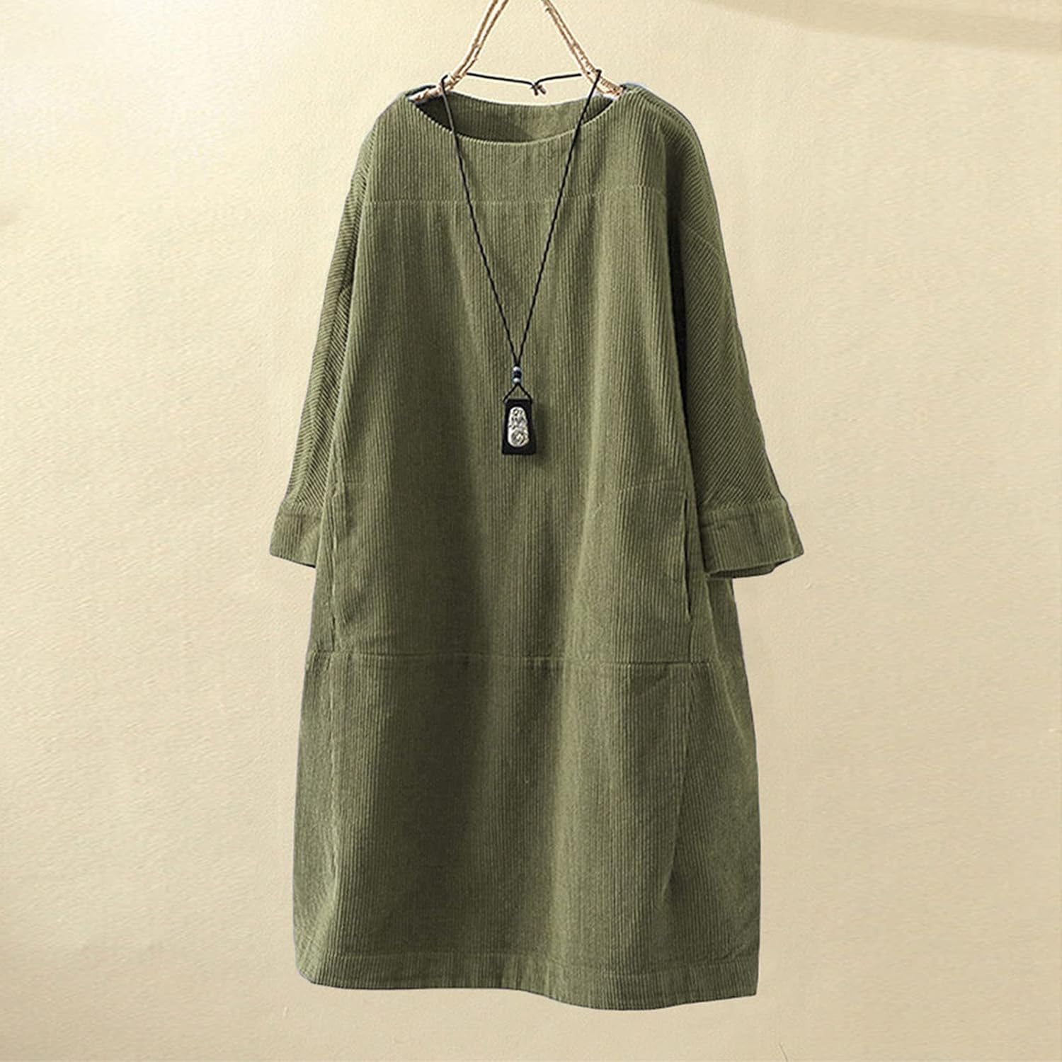 Plus Size Party Elegant Women O-Neck Long Sleeve Corduroy Solid Pockets Casual Dress Sale Clearance UK Size S-5XL
